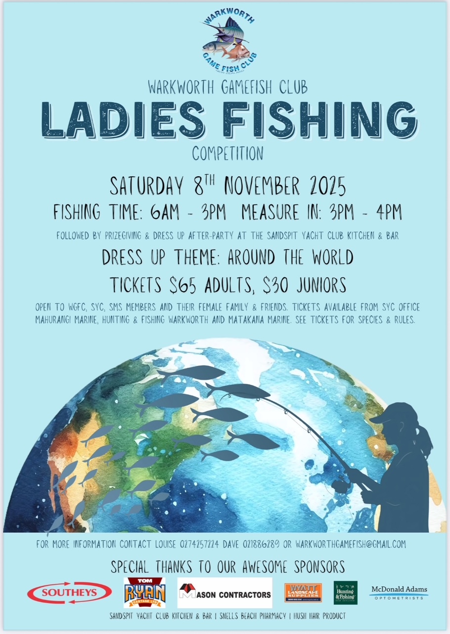 Tickets available now at WW Hunting & Fishing, Matakana Marine, Mahurangi Marine and Outdoor & Tackle. Ticket includes Sunday prizegiving dinner!